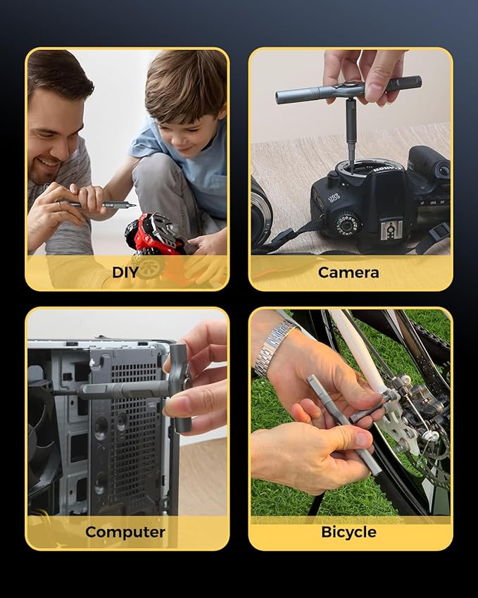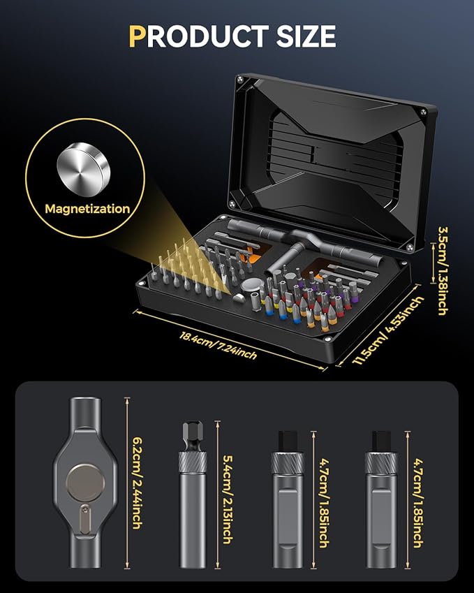 - ⚙️【Enhanced Magnetic Functionality】All bits in this magnetic screwdriver set are strongly magnetized for quick changes and secure screw retention, preventing loss during use. A built-in magnetizer replenishes magnetic strength over time, ensuring reliable performance in assembling electronics, repairing automobiles, and other precision tasks.