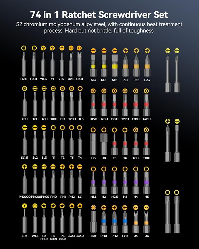 - ⚙️【Robust and Long-Lasting Material】Crafted with a durable aluminum alloy T-handle and S2 steel bits, this 74 in 1 ratchet screwdriver set is built to resist wear and withstand frequent use. The combination of hardness and toughness ensures longevity, making it suitable for heavy-duty applications without compromising performance.