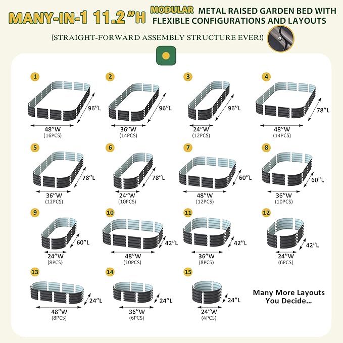 - MANY-IN-1GARDEN BED – This elevated planter box comes with 4 corner panels and 12 side panels, allowing for multiple modular configurations to match your outdoor space. The flexible design makes it easy to customize your raised planter box for use in the garden, backyard, balcony, or patio, creating the perfect planting area wherever you need it.