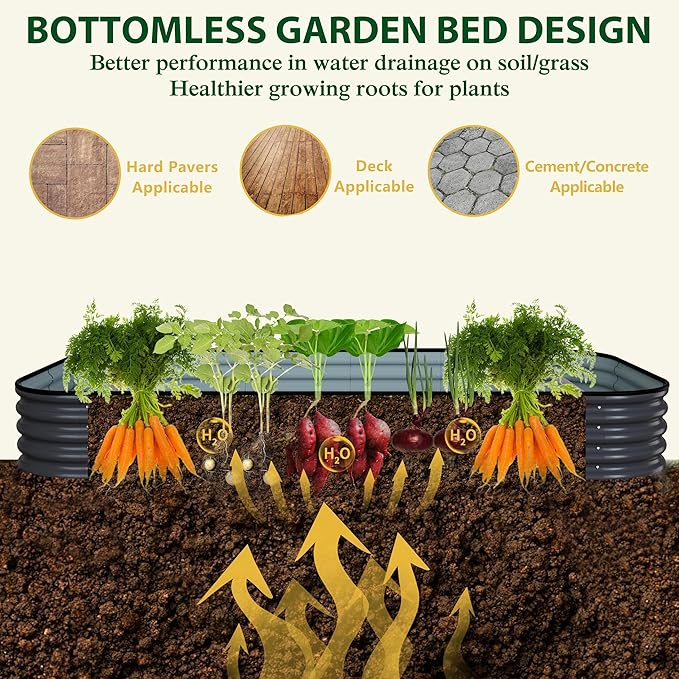 - OPEN-BASE DESIGN – Featuring a bottomless design, this raised garden bed provides superior soil drainage and encourages healthier root development on both soil and grass. Ideal for growing vegetables like lettuce, beans, tomatoes, and potatoes, or for planting colorful flowers, this oval planter box is both versatile and functional.