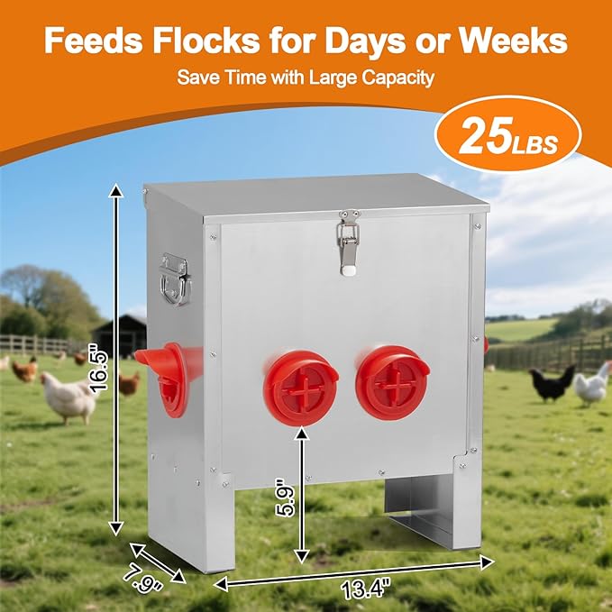 - 25LBS CAPACITY -- Hold up to 25lbs of feed in this automatic chicken feeder, reducing refills and saving time. Ideal for backyard coops or small farms, this automatic chicken feeder keeps food available for flocks of all sizes.