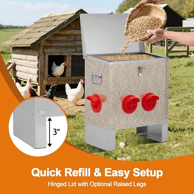 - EASY REFILL AND VERSATILE USE -- The hinged lid opens for quick refills, while the elevated legs lift the feeder to avoid ground moisture. Suitable for chickens, ducks, turkeys, and other poultry, it works perfectly in coops, barns, or free-range areas.