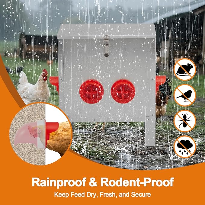 - RAINPROOF AND RODENT PROOF -- The covered ports and hinged locking lid keep feed dry, fresh, and safe from rodents or wild birds. This rat-proof chicken food dispenser helps reduce waste while protecting valuable feed from unwanted animals.