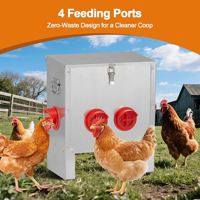 - NO WASTE FEEDING DESIGN -- Equipped with 4 feeding ports, multiple chickens can eat at once without scattering food. The no-waste system prevents mess, reduces feed loss, and keeps the coop clean.