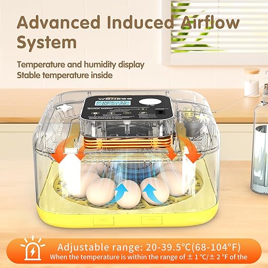 - 【Precise Temperature and Humidity Control】Advanced PID technology keeps incubation conditions steady at 99.5°F ±0.5°F and 55–65% humidity. The 360° airflow system eliminates hot/cold spots, while over-temperature protection ensures a safe hatching environment