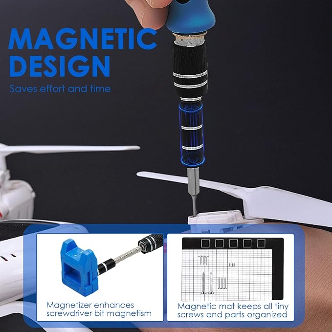 - Double Magnetic Design: 5.7 * 3.5 " Magnetic pads can keep all tiny screws and parts organized, preventing loss and mess, making your repair work more efficient. And the magnetizer demagnetization tools help strengthen the magnetism of the screwdriver head to grip screws, or weaken it to avoid damaging your sensitive electronic devices.