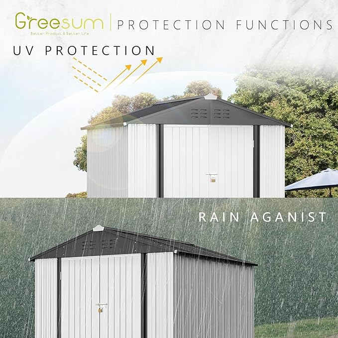 - Durable & Stable Storage Shed: Durable construction and thicker galvanized steel make this durable lifetime shed rust and UV resistant. The overlapping wall panels are water and moisture resistant for worry-free use in all weather conditions.