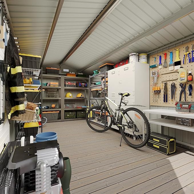 - Ample Storage Space with Multiple Options: Measuring 10 x 12 FT, this outdoor storage shed provides generous space to meet all your outdoor storage demands. This durable metal garden shed is perfect for storing snow blowers, shovels, outdoor chairs, bicycles, and toy cars. For added organization, you can consider purchasing storage racks to neatly arrange items such as shovels, umbrellas, antennas, ladders, and more within this versatile storage solution.