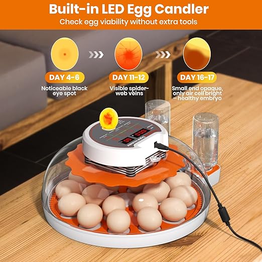 - 【Automatic Egg Turner for Higher Hatch Rates】This egg incubator automatically turns eggs every 120 minutes to mimic natural incubation, ensuring even heat and humidity for better hatch results. The incubator stops turning three days before hatching to protect the chicks, Easy to use and reliable, this incubators for hatching eggs is ideal for both beginners and professionals.
