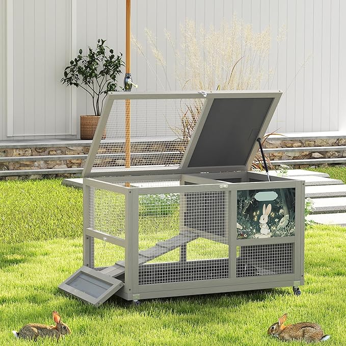 COZIWOW 36.5-Inch Double-Decker Wooden Rabbit Hutch with Wheels, Featuring A Cleaning Tray and Ladder—Stylish and Easy to Assemble(Grey and Pattern)