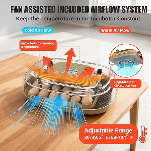 - 【Smart 360° Auto Turner for Hatching Eggs】This automatic egg incubator for hatching chicken, quail, duck, and goose eggs features a smart turning system. It gently rotates eggs every 60/120/180 minutes to perfectly mimic natural hen behavior, ensuring even warmth and significantly increasing your hatch success rate. It's a reliable incubator for chicken eggs and more.