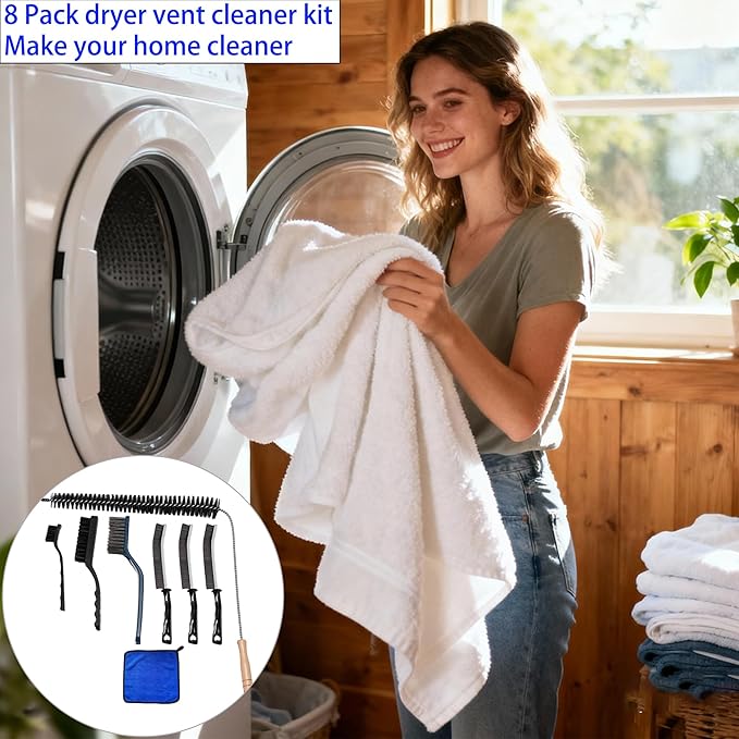 - Complete Cleaning Kit for Dryer & Home Surfaces: This dryer vent cleaning kit includes 1 flexible dryer vent brush, 3 crevice brushes, 1 hard-bristled brush, 1 cleaning cloth, and 2 anti-static brushes. Together, they thoroughly remove lint, dust, and debris from dryer vents, lint traps, rubber seals, and hard-to-reach gaps—preventing fire hazards and improving appliance efficiency.