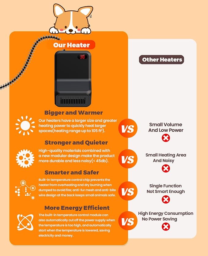 - 【Pet Safety Heater】: The dog house heater integrates multiple safety features, including a functioning thermostat, an anti-chew cord and overheat protection.The insulated surface prevents any potential burns from touching the heater, making it perfectly safe for your pets
