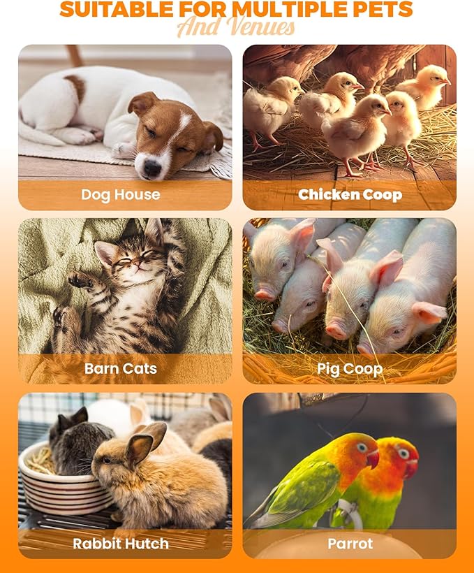 - 【Multi-environment To use】:The pet house heater are not only ROHS certified and but also have passed the UL certification,with PTC heating element, flameless and high thermal efficiency, is suitable for outdoor kennels,chicken coop, rabbit coop/cage, pet pigs to help them winter