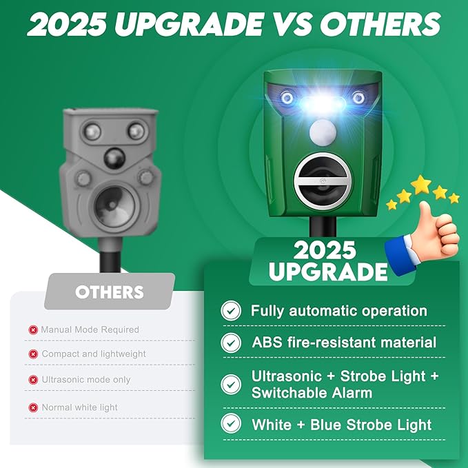 - [Effective Protection]: Utilizing a combination of adjustable ultrasonic waves, intense flashing strobe lights, and optional alarm sounds, this deer repellent devices effectively disrupts the senses of deer, cats, dogs, raccoons, rabbits, skunks, and more. The varying frequencies prevent adaptation, ensuring long-term effectiveness.