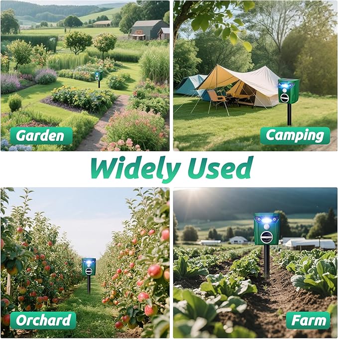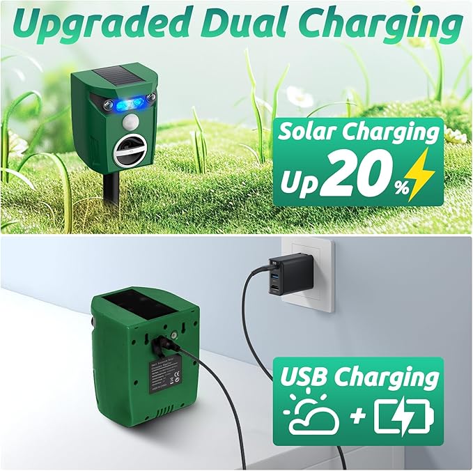 - [Solar-Powered and Weatherproof]: Equipped with a high-efficiency solar panel for continuous charging, this animal repellent operates wirelessly and maintenance-free. Its IP64 waterproof rating guarantees reliable performance in various weather conditions, making it ideal for year-round use in gardens, yards, farms, and orchards.