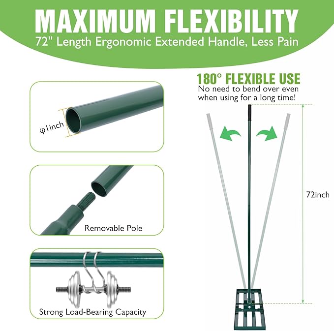 - ERGONOMIC HANDLE: This yard leveling rake tool features an ergonomic 72-inch handle with an adjustable angle (0° to 180°). The two-section handle design and removable handle section allow for custom length adjustments for increased efficiency. The soft rubber handle provides a secure and comfortable grip, reducing hand fatigue, back pain, and blisters from prolonged use. In just half an hour, your entire lawn will be smooth and looking its best