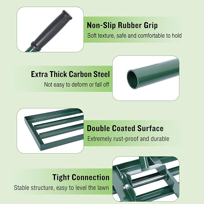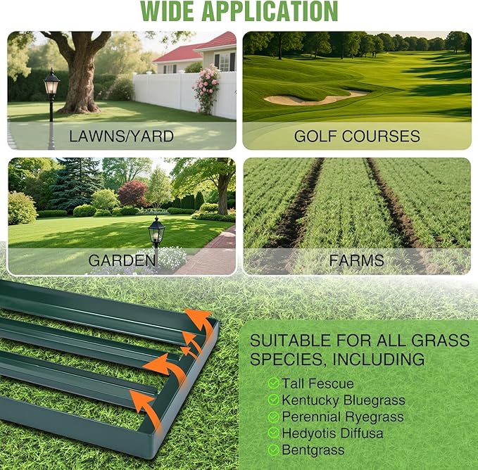 - PERFECT SIZE FOR YOUR NEEDS: Our lawn leveling tool is available in 3 different base sizes - 30" x 10", 36" x 10", and 42" x 10", perfect for yards of any size. The perfect size saves you time and energy, allowing you to level large areas in fewer passes, reducing trips and working faster, leaving you more time to enjoy your lawn. It's suitable for a variety of lawn types, including Bermuda, Kentucky bluegrass, ryegrass, St. Augustine, and fescue. Works best when grass is cut to 1.5" or less