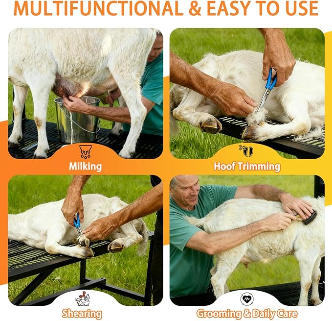 - 【EASY ASSEMBLY & SPACE-SAVING】Assemble the goat grooming stand in short time alone, no extra tools needed. When not in use, it can be partially disassembled or stored upright, taking up minimal space in sheds, barn corners, or small farm storage areas. Light enough for hobby farmers to move between pastures or barns, but tough enough for daily use.