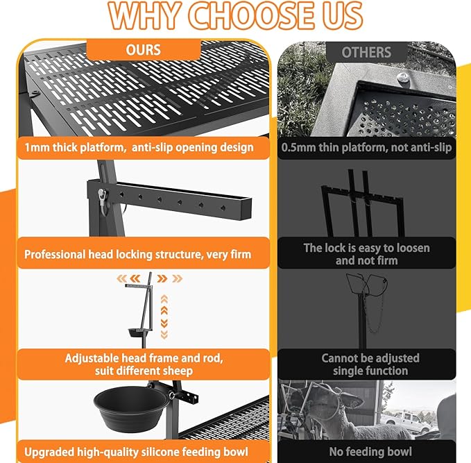 - 【UPGRADE THICK & ANTI-SLIP PLATFORM】Upgrade platform is crafted with thickened 1.0 mm steel— far more durable than other thin 0.8mm frames. Supports up to 600 lbs, stable enough for adult goats (Nubian, Alpine, Boer) and growing lambs. Panel's anti-slip opening design prevents wobbling during milking or grooming—keeping both you and your animals safe, even for daily use on small hobby farms.