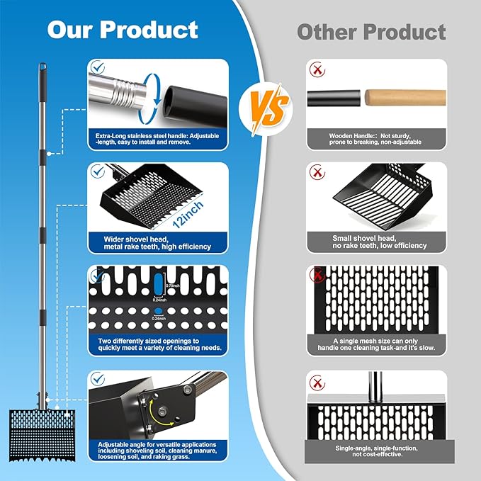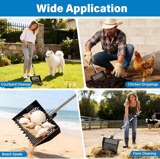 - 【Multi-Use Sifting Shovel, Easy to Clean】This metal pooper scooper serves not only as a chicken coop scooper for poop, cat litter scoop, dog pooper scooper, or soil scoop, but also as a sand sifter/scoop for the beach—it’s a handy backyard/farm tool. It works for sifting hemp bedding for chickens, and cleaning duck/goat/horse/cow stalls. A versatile tool for any farm, garden, or pet household. The rust-resistant surface cleans easily with water