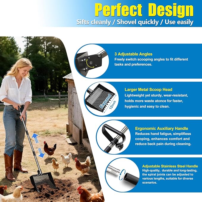 - 【Revolutionary 2-in-1 Chicken Poop Scooper & Rake】This 2-in-1 chicken poop scoop combines a chicken coop rake and scoop shovel - clean your chicken run house effortlessly with one tool. The rake teeth gather waste and feathers fast, while the sifting scooper separates chicken coop bedding from debris. The ergonomic long handle eliminates bending, making it gentle on your back and knees. A must-have for every chicken keeper