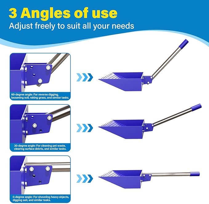 - 【4-in-1 Adjustable Stainless Steel Handle & 3 Angles】Switch instantly between four lengths — 24", 37", 51", 64" — with a secure twist-lock. Perfect for all heights and scenarios, this chicken pooper scooper long handle makes cleaning easier and reduces fatigue. The ergonomic non-slip grip ensures comfort, and the 3 adjustable angles rake make one scooper cover multiple jobs, saving you time and hassle