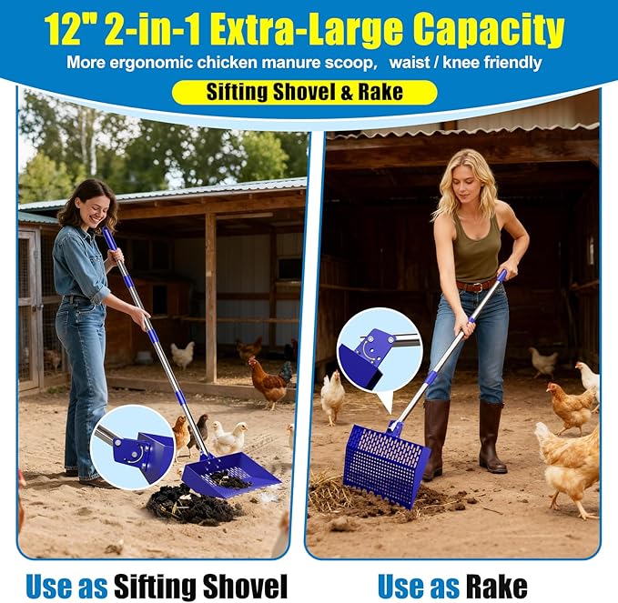 - 【Revolutionary 2-in-1 Chicken Poop Scooper & Rake】This 2-in-1 chicken poop scoop combines a chicken coop rake and scoop shovel - clean your chicken run house effortlessly with one tool. The rake teeth gather waste and feathers fast, while the sifting scooper separates chicken coop bedding from debris. The ergonomic long handle eliminates bending, making it gentle on your back and knees. A must-have for every chicken keeper