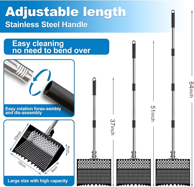 - 【adjustable stainless steel handle】The four detachable stainless steel handles can be extended up to Can be adjustable to 24",38", 53" and 68", inches with a simple threaded connection, making them suitable for a variety of applications, including narrow chicken coops, deep composting areas, wide sand sifting areas, and horse stables. The included detachable handle ensures a secure grip and can be adjusted to suit your preferences, making scooping, raking, and other tasks more convenient.