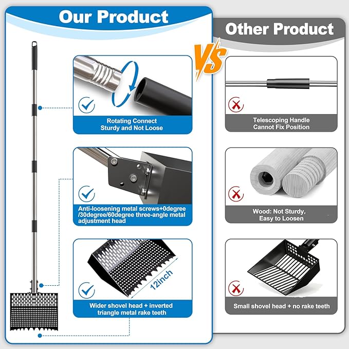 - 【Multi-purpose 2-in-1 raking and sifting scoop】heavy-duty manure scoop combines the functions of a raking scoop and a sifting scoop, making it a single tool for efficiently cleaning chicken coops, horse stables, sifting sand, and raking debris. No need to switch between a shovel and a rake. A key feature of this manure scoop is its inverted triangular tines, which remove manure and other debris more effectively than other stick-shaped or even tined scoops.