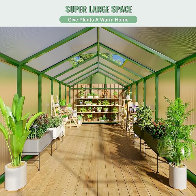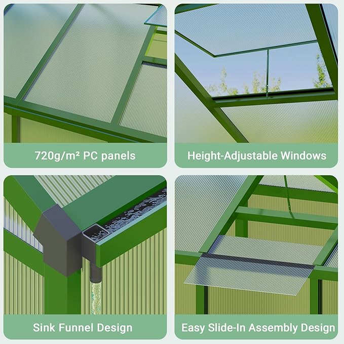 - 【Fast, Easy Assembly】The greenhouse uses a slide-in panel system that makes installation more straightforward and efficient. Panels are designed to glide into the frame, reducing the time and effort needed during setup. Clear, simple steps guide you through the process, so you can get your growing area ready more quickly. Once assembled, the structure offers improved steadiness, creating a dependable space for your daily gardening work and seasonal planting plans