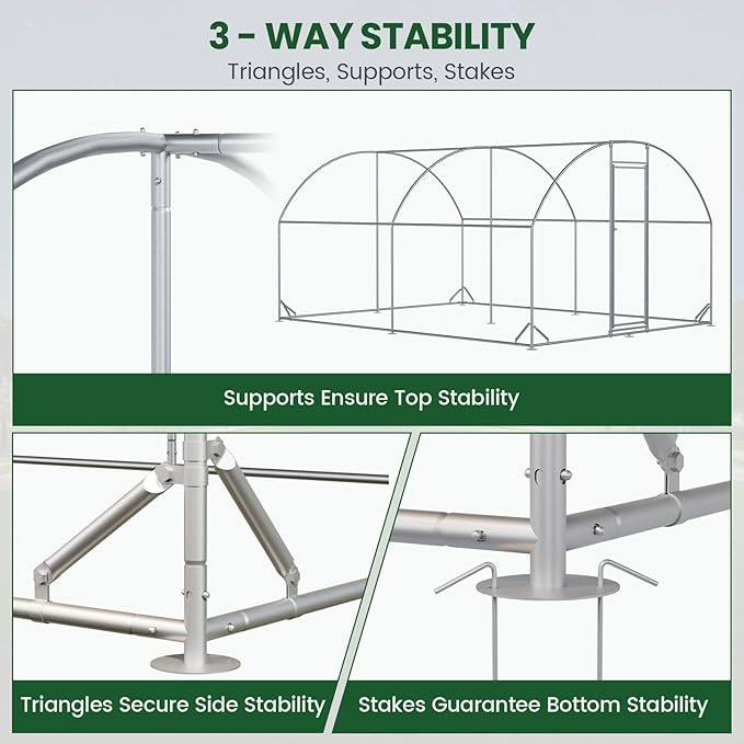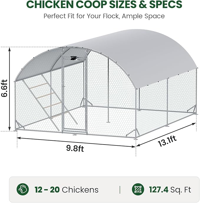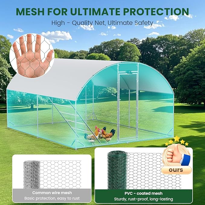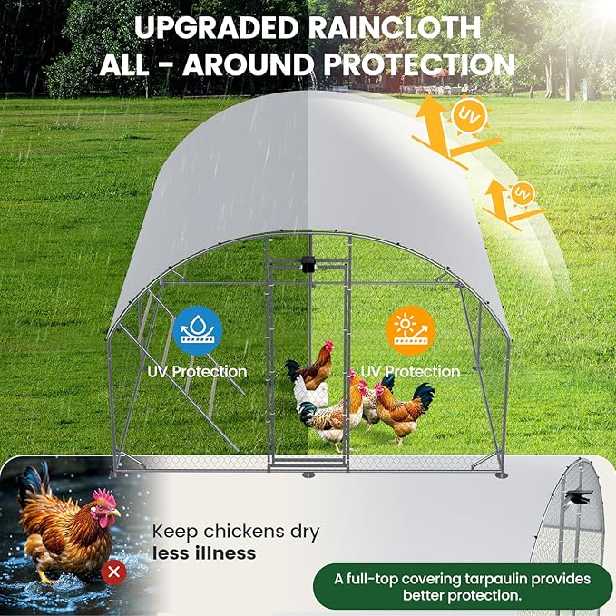 - 🐥【Convenient & Safety Lockable Door】:This chicken run for yard with cover is designed with a firm gate, reinforced door, and lock function for easy access in and out. The narrowed gap to avoid chickens escaping and wild animals (like foxes, weasels) entering, fully protecting the safety of your poultry.