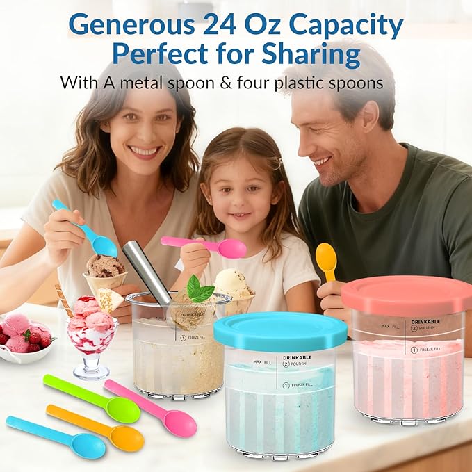 - 【Perfectly compatible, versatile flavors available】Designed specifically for the Ninja NC500/NC501 series ice cream makers, each set comes with four 24oz clear ninja creami containers, four color-coded lids and scoops, and an aluminum spoon, making it easy to prepare and remove ice cream at the same time. Color-coded flavors make it easy to identify flavors, satisfying the preferences of different members and enhancing both efficiency and enjoyment.