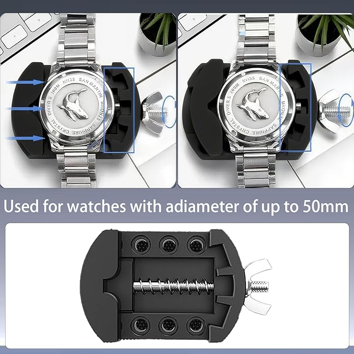 - 【Stable and Secure Watch Holder】 The watch case holder stabilizes the watch, preventing slipping and scratching while opening the back case or changing bands. It supports watches up to 50mm in diameter and provides a firm grip to ensure safer and easier repair operations.