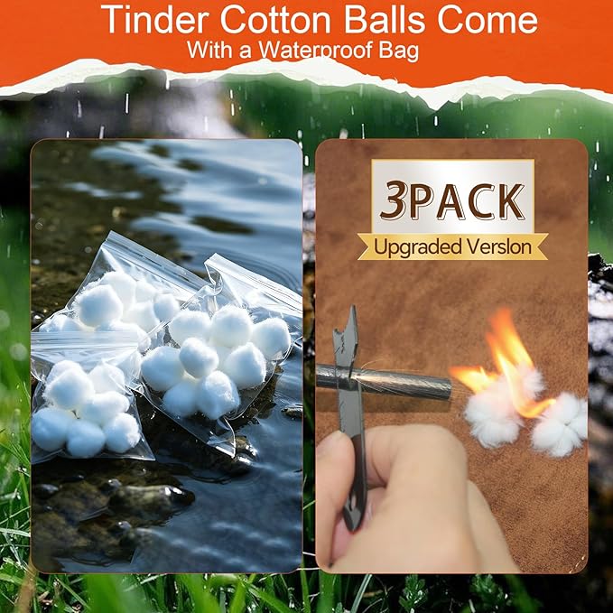 - 3. Reliable Flint Fire Starter: Our tinder balls are protected by waterproof bags. Even if they get wet in a downpour or are accidentally soaked in water, the survival fire starter can continue to be used after being wiped dry, and it can be hit continuously for more than 12000 times.