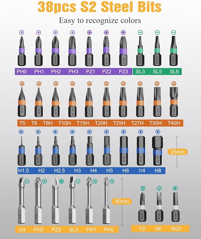 - ใ๐0-๐ข๐ง-๐ ๐๐๐ ๐ง๐๐ญ๐ข๐ ๐๐๐ซ๐๐ฐ๐๐ซ๐ข๐ฏ๐๐ซ ๐๐๐ญใThis ratcheting screwdriver set includes 32 short bits and 6 long bits, covering PH, SL, Torx, Hex, U-shaped, and PZ types for universal compatibility. The screwdriver set meets the needs of professional use, home life, work, DIY, repair, every scenario is handled with ease