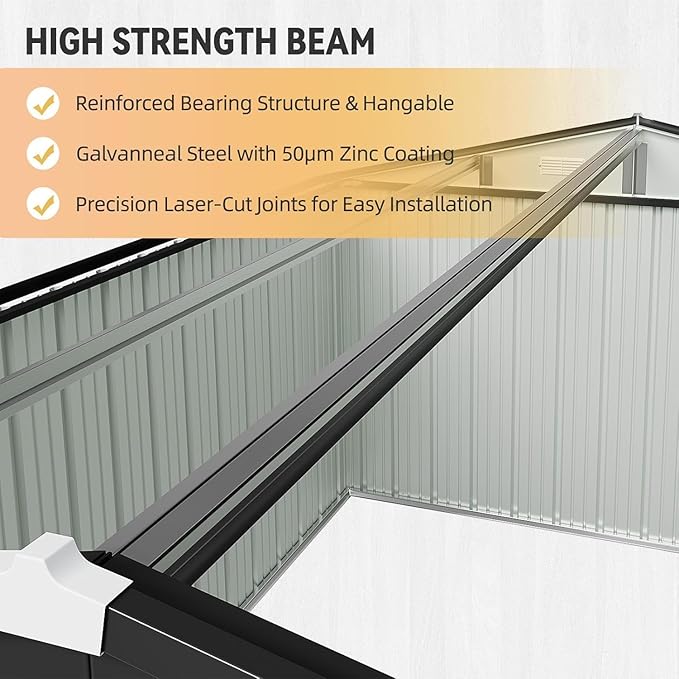 - All-Weather Performance & Space Optimization: Engineered with crush-resistant wall panels and waterproof joints, this garden shed withstands snow loads and heavy rains. The depth maximizes vertical storage for tall equipment, while the sloped roof design adds overhead clearance. Optional shelving racks (not included) help organize shovels, umbrellas, and gardening tools