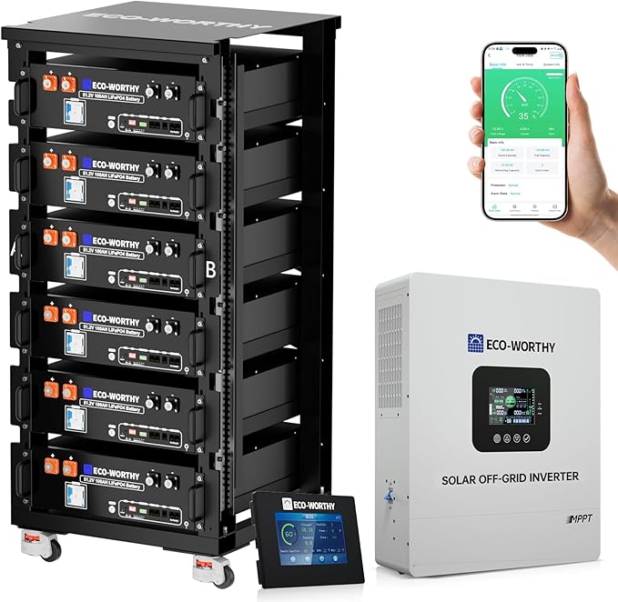 - [Package Contents]: This Home power station includes one 5000W off-grid inverter, six 48V 100Ah lithium batteries, a battery monitor and 6-Layer Server Rack(Buy 6 batteries get a monitor and a 6-Layer Server Rack)Please note the product ships in multiple packages and ensure all components are received.