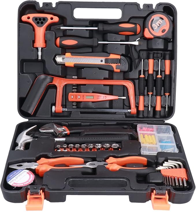 - [COMPLETE HOME REPAIR SOLUTION] Our comprehensive set includes every essential tool for household maintenance and DIY projects, from professional hex wrenches and ratchet screwdrivers to pliers, hammers, utility , and precision measuring tools. This all-in-one kit eliminates the need for multiple separate tool purchases.