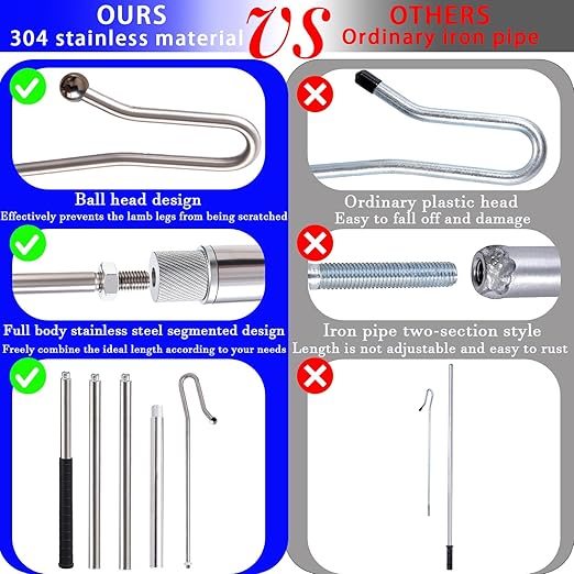 - 304 Stainless Steel Material: The arc eight-mouth design makes it easier to catch sheep, and the round steel balls on the head prevent scratches on the sheep legs. We gave up the traditional steel pipe material and used 304 stainless steel throughout, which has a cleaner appearance, more exquisite workmanship, stronger corrosion resistance, and is not easy to rust.