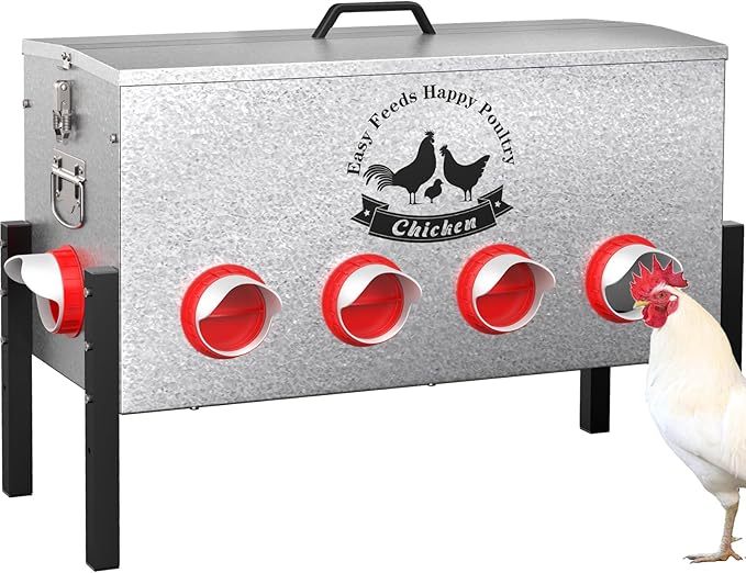 - 【Pest- & Weather-Proof Protection】The lockable top lid turns the unit into a reliable rat proof chicken feeder by blocking rats, rodents, and larger pests from accessing feed. As a durable metal chicken feeder, its leak-proof sealing cap keeps rain, moisture, and debris out, ensuring the feed remains dry, clean, and fresh—perfect for outdoor coops.