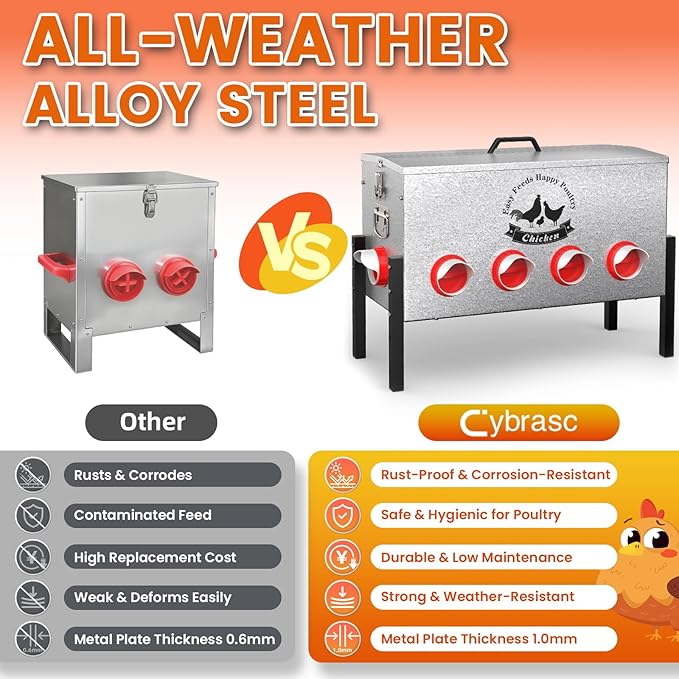- 【Rust-Proof Alloy Steel Chicken Feeder】Cybrasc poultry feeder is made of heavy-duty alloy steel that resists rust and corrosion for long-lasting durability. Unlike plastic or flimsy metal feeders, it won’t rust through, deform, or contaminate feed, keeping food clean and hygienic for your chickens. The smooth surface makes cleaning easy, reducing maintenance time and replacement costs, while the sturdy structure resists impact and temperature changes. —perfect for reliable poultry feeding.