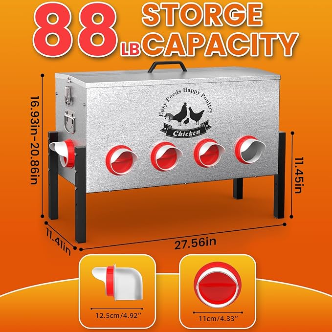 - 【16gal Larger Capacity & 10-Port Feeding】This large chicken feeder holds a generous 16 gallons of feed, drastically reducing refill frequency for medium to large flocks. Ten spacious feeding ports allow multiple chickens to eat simultaneously, minimizing competition and ensuring all birds get fed.