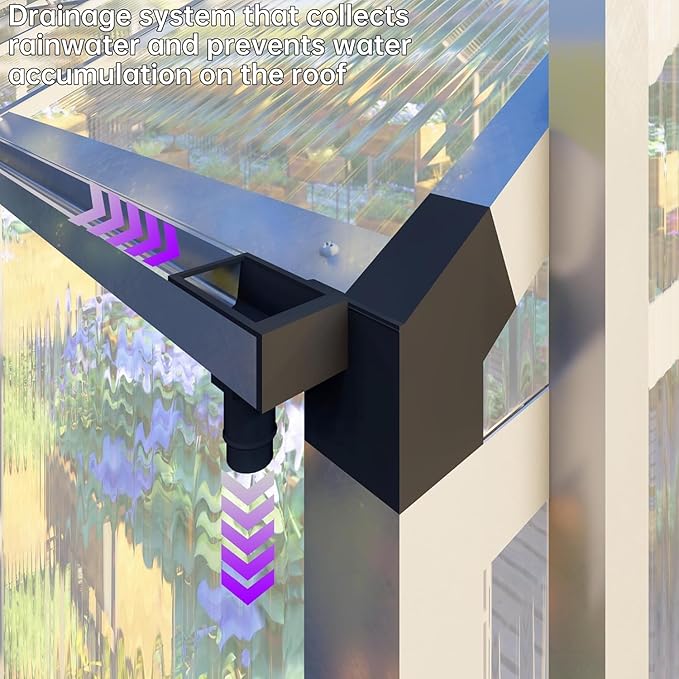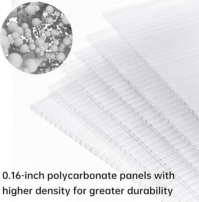 - POLYCARBONATE PANELS: The twin-wall polycarbonate panels provide excellent thermal insulation and humidity control. They let in abundant sunlight while blocking harmful UV rays, creating a stable and nurturing environment for plants year-round.