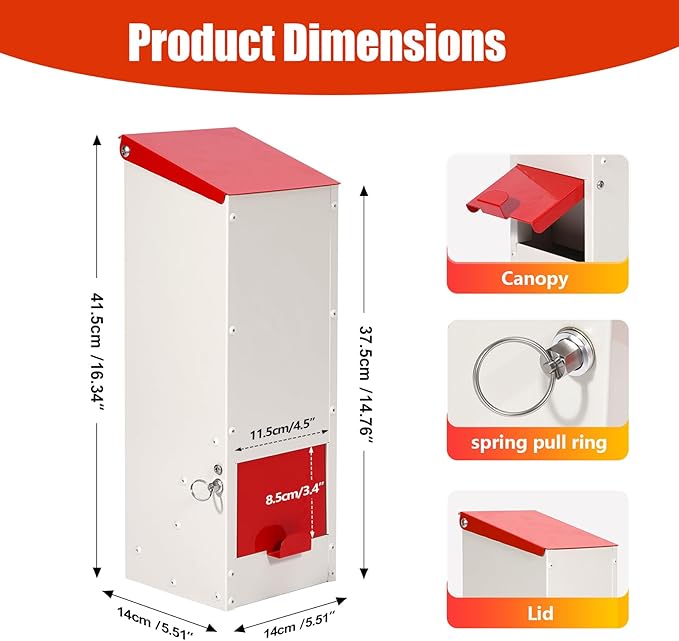 - NEW DESIGH: This automatic chicken feeder features a top lid and rain cover to keep feed dry and fresh; Close the cover at night can prevent small animals from stealing food and open it for weather protection