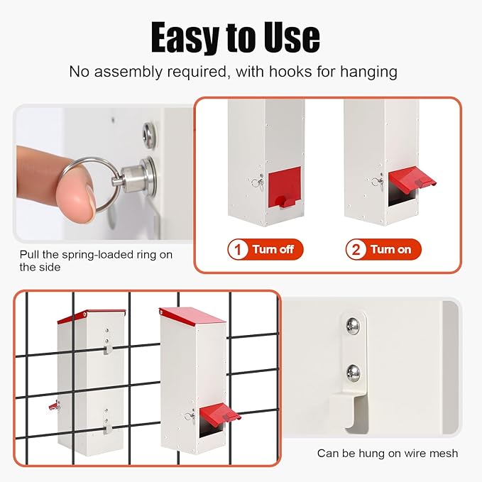 - EASY TO USE: This chicken food dispenser does not require assembly and has 2 hooks on the back, making it easy to hang anywhere you need
