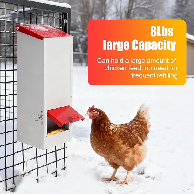 - 8LBS CAPACITY: The poultry feeder can Holds plenty of oyster shells, grit, or feed, reducing the need for frequent refills. Keeps your poultry well-fed with minimal maintenance
