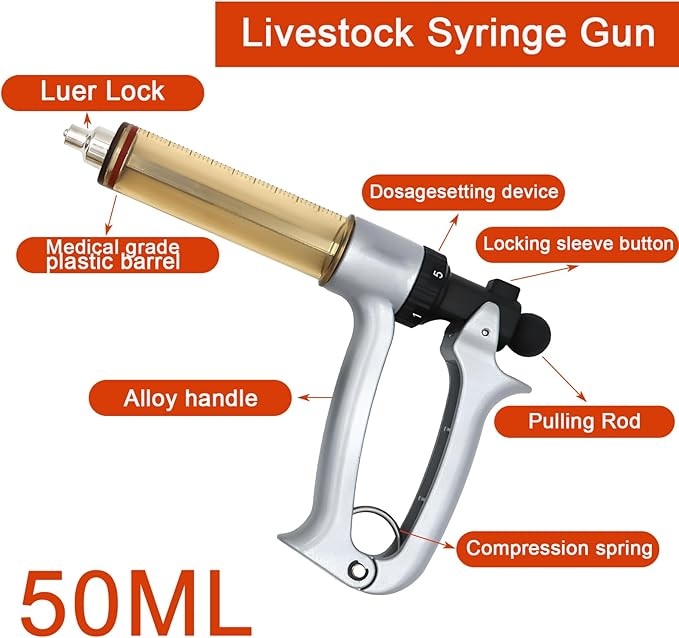 25ML Livestock Syringe Gun, 5 Gears Adjustable Continuous Repeating Luer Lock Syringe, for Chickens, Ducks, Goose, Pig Bull Sheep, Large And Small Animals