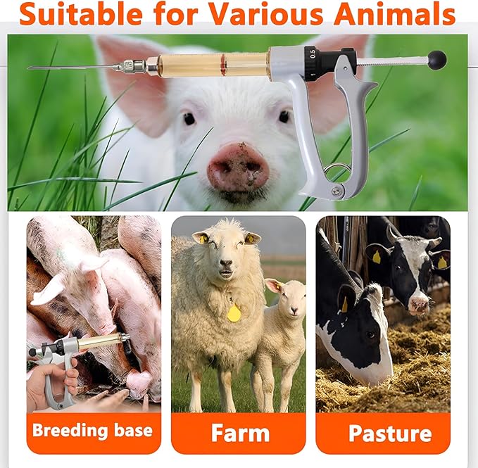 - 5 Gears Adjustable: Livestock syringe has clear scales 5 gears rotation adjustable Injection dose requirements to reduce vaccine waste, and the adjustment range of 50ml veterinary syringe is 0.5-2.5ml. with 10 Needles 12*25, can be continuous injection, save time and effort