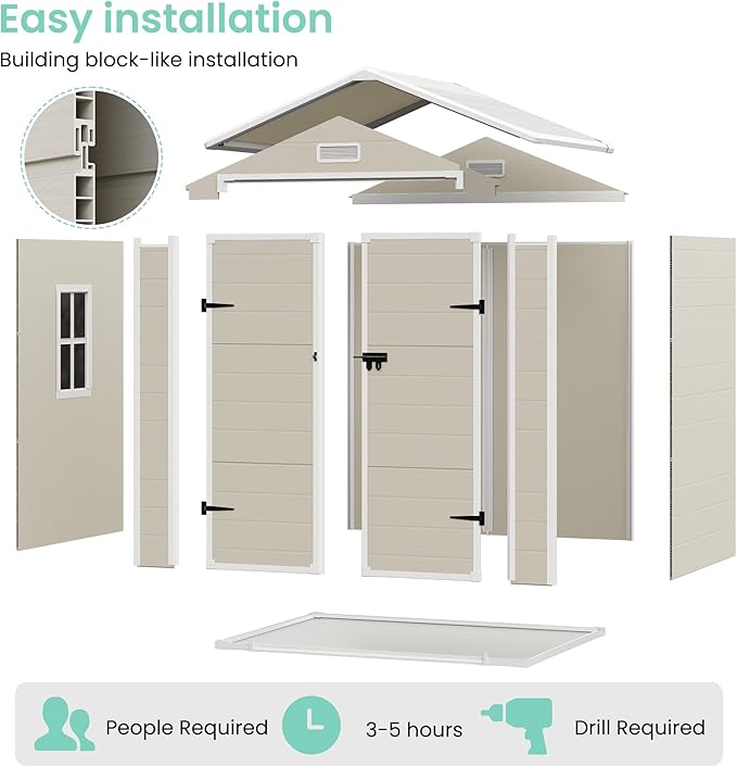 - EASY INSTALLATION: The building block-like installation method greatly reduces the installation difficulty as well as time. The screws are embedded to ensure beauty and safety. Our easy-to-follow instructions come with detailed illustrations, with clear numbering on all hardware and parts, the shed may need to be assembled with 2 persons in 4-6 hours